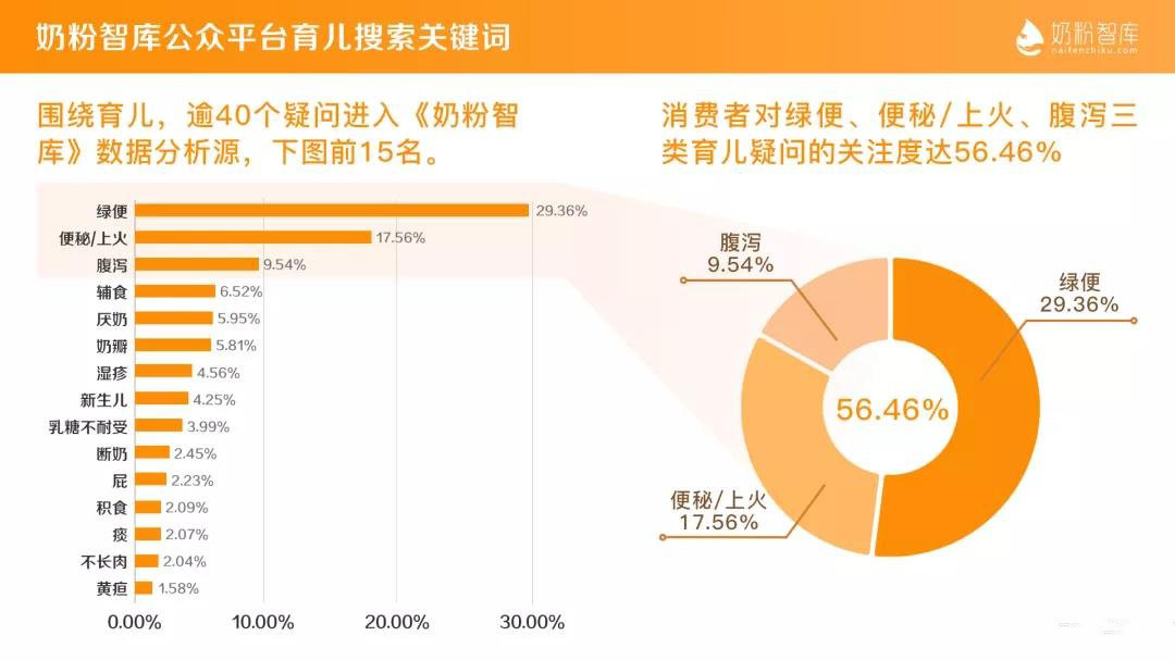 《2020年奶粉智库微信公众平台用户搜索关键词数据报告》显示,围绕育儿有逾40个疑问进入2020年奶粉智库微信公众平台数据分析源,其中绿便、便秘/上火、腹泻三类育儿疑问的关注度达56.46%。